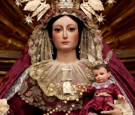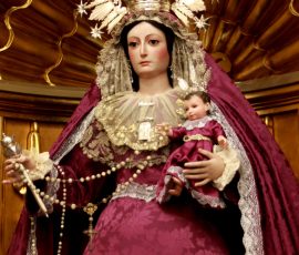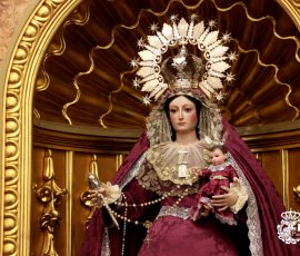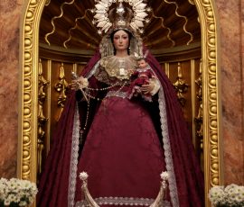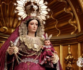 Nuestra Señora del Rosario viste terno y manto con el característico color morado, propio de la Cuaresma, como anuncio del tiempo litúrgico que nos prepara para conmemorar la Pasión, Muerte y Resurrección de Jesucristo.